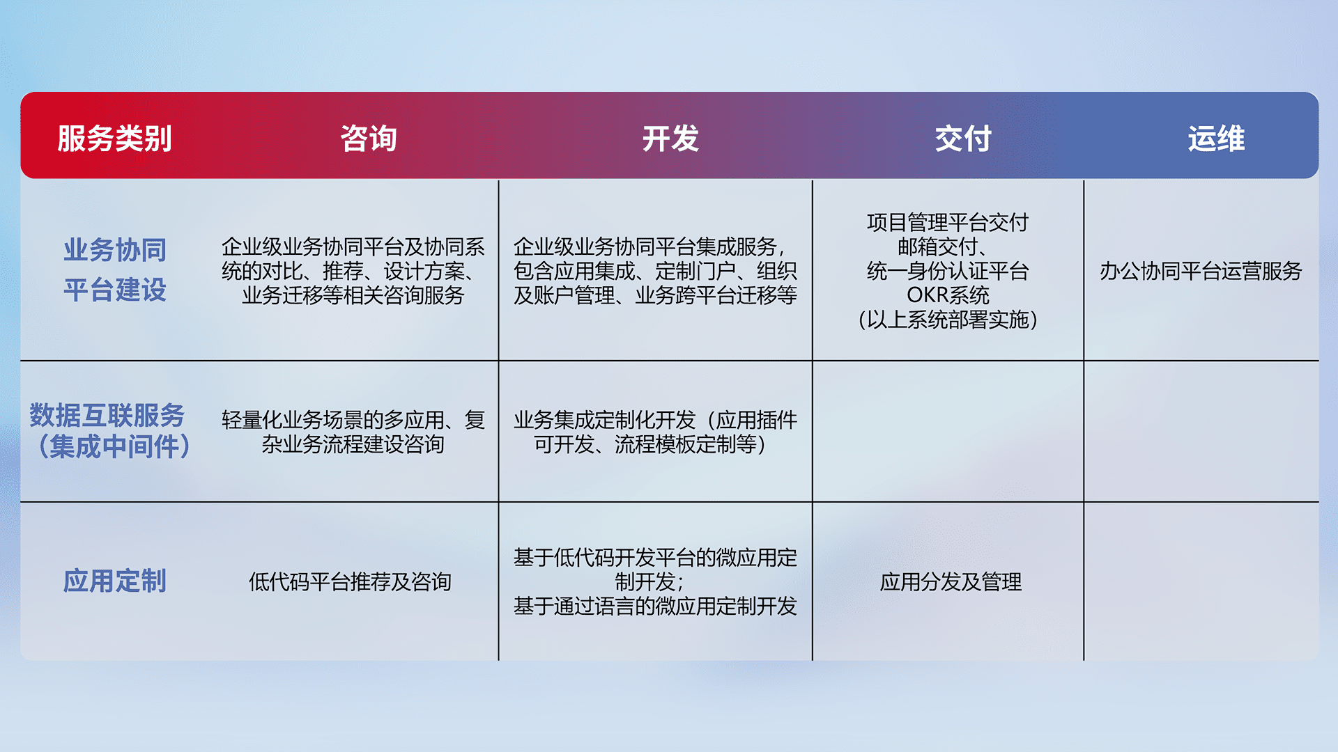 针对钉钉、、、、企微、、、IDaas等平台级产品提供产品的规划、、方案、、、交付、、、、定制化开发等服务,,,,实现如统一协同办公、、智能客户服务、、、、混合会议管理、、、智能数据查询、、、、等业务场景,,实现数字化转型。。。。